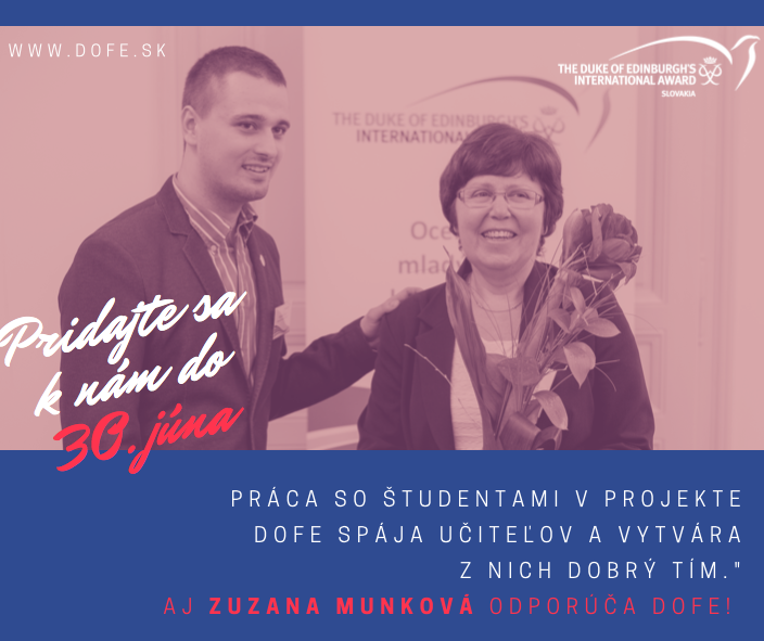 Aj vaša škola sa môže zapojiť do programu Medzinárodná cena vojvodu z Edinburghu a dať šancu mladým plniť svoje ciele. A DofE vie posunúť aj učiteľov, ktorí prejdú mentoringovým školením. Prihlásiť sa môžete do 30. júna 2017 na tomto linku.