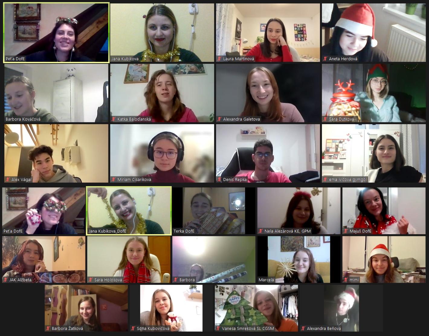 V dňoch 13. a 14. decembra odštartovali čas vianočný aj dve online párty pre DofE Ambasádorov z celého Slovenska. Pod taktovkou našich programových manažériek Janky, Peťky a Terky sme s Ambasádormi privítali sviatočného ducha v príjemnej a priateľskej atmosfére. Ambasádori boli náhodne rozdelení do dvoch skupín: “Rozprávala som sa s Ambasádormi, ktorých som doteraz nestretla a všetci boli ako vždy priateľskí a zhovorčiví,” dodáva Ema z Gymnázia Golianova 68 v Nitre.